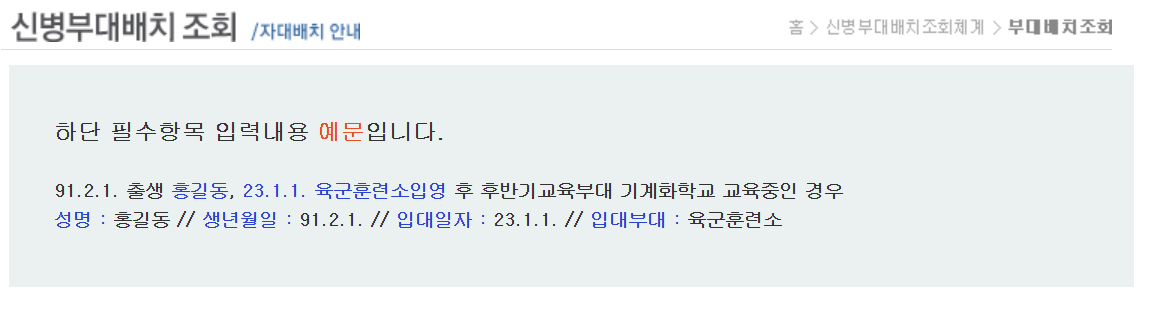 - 입소 후 훈련병의 부대 배치 결과를 확인할 수 있는 서비스입니다.
