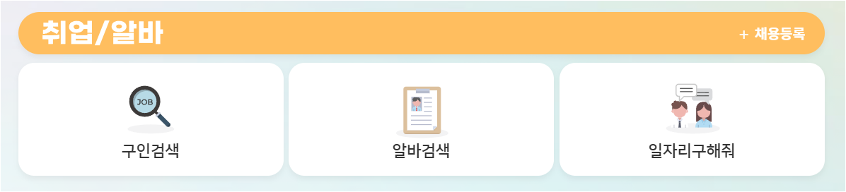 '취업알바' 섹션에서는 지역 내 다양한 구인구직 정보를 확인할 수 있습니다. 직종별, 지역별로 필터링이 가능하여 원하는 일자리를 쉽게 찾을 수 있습니다. 또한, 상세한 근무 조건과 연락처 정보도 함께 제공되어 구직자들에게 유용합니다.