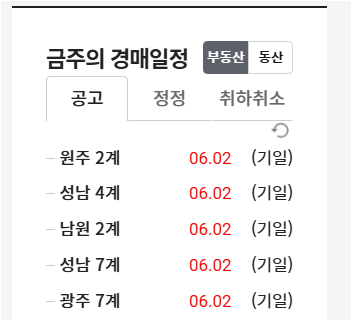 - 기일검색: 특정 법원의 입찰 예정일과 진행 중인 사건들을 기일별로 검색 가능합니다.