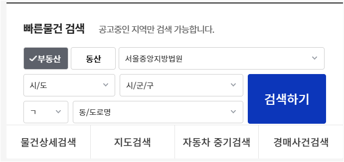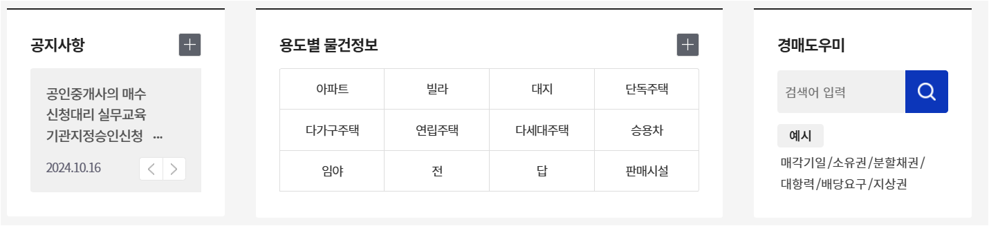 - 물건검색: 원하는 지역, 물건 종류, 입찰기일 등을 기준으로 경매 물건을 검색할 수 있습니다.