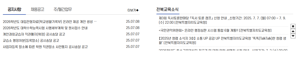 홈페이지 첫 화면에는 교육청에서 발행하는 최신 공지사항과 교육 소식이 업데이트됩니다. 이를 통해 학사 일정 변경, 교육 관련 정책 안내, 행사 일정 등을 빠르게 확인할 수 있습니다.