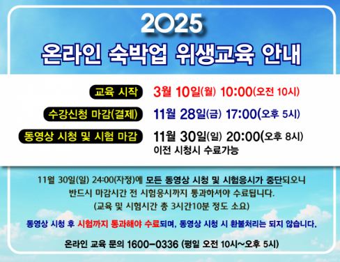 온라인 위생교육은 숙박업 운영에 필수적인 위생 지식과 고객 서비스 기본 지침을 포함하고 있습니다.