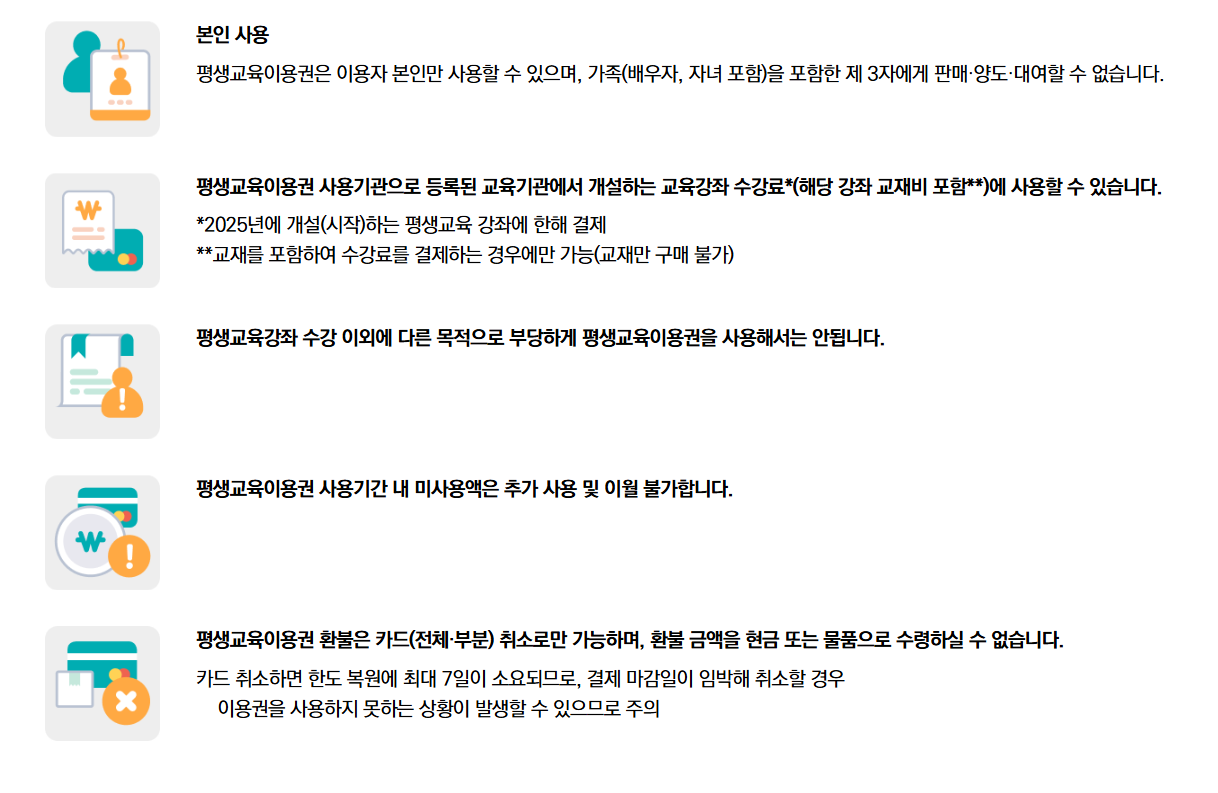 평생교육 바우처는 경제적·사회적 여건으로 인해 학습 기회가 부족한 성인에게 교육비를 지원해주는 제도입니다. 바우처 형태로 제공되어 원하는 교육기관에서 자유롭게 사용할 수 있으며, 국민 내 삶의 질 향상과 직업 역량 개발을 돕기 위한 목적으로 운영되고 있습니다.