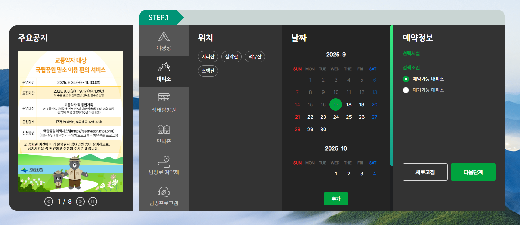 로그인 후 상단 메뉴에서 ‘대피소 예약’, ‘야영장 예약’, ‘탐방예약’ 등의 항목을 선택합니다. 원하는 국립공원과 시설을 선택한 후 날짜와 인원을 설정합니다.