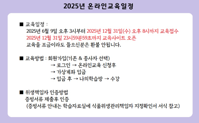 위생교육은 단순히 법적 의무를 채우기 위한 절차가 아니라 영업장의 지속적인 발전과 고객 신뢰 확보를 위한 중요한 과정입니다. 정기적으로 교육을 이수하고 이를 실무에 철저히 반영한다면 안전한 영업 환경을 조성할 수 있으며, 업소의 경쟁력 또한 강화할 수 있습니다.