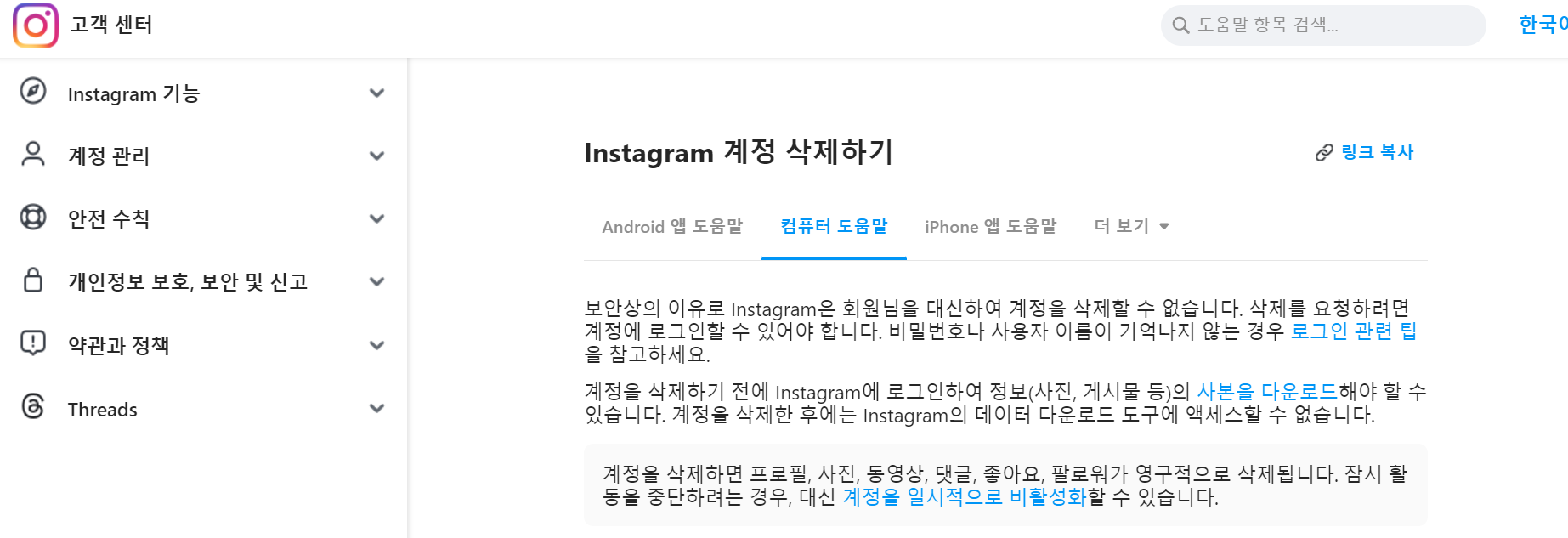 인스타그램 고객 지원에서 추가적인 지원과 도움을 받을 수 있습니다. 이상 마치겠습니다.