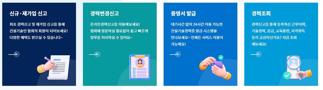 홈페이지에서는 건설기술인의 경력 신고와 승인을 처리할 수 있습니다. 현장에서 쌓은 경력을 체계적으로 등록하면 협회에서 심사와 승인을 거쳐 공식적으로 인정받을 수 있습니다.