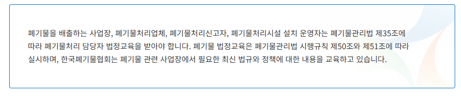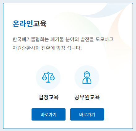 한국폐기물협회는 폐기물관리법에서 정한 의무교육을 비롯해 공무원 대상 직무교육까지 폭넓게 제공합니다. 오늘은 홈페이지 바로가기 안내해드리겠습니다.