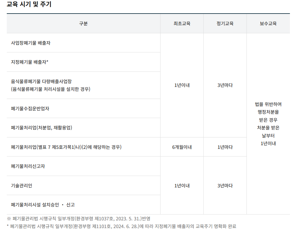 대부분의 과정은 6시간으로 구성되어 있으며, 최초 교육은 지정된 기간 내에 반드시 이수해야 합니다. 이후 정기교육은 일반적으로 3년마다 실시되지만, 지정폐기물 배출자나 처리업 기술요원처럼 특수한 경우에는 매년 교육을 받아야 합니다. 또한 법 위반으로 행정처분을 받은 경우에는 처분일로부터 1년 이내 보수교육을 이수해야 합니다.
