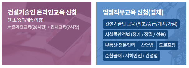 건설기술교육원은 건설산업에 종사하는 기술인들의 전문성과 역량 강화를 위해  온라인 교육센터를 통해 최초교육, 승급교육, 계속교육 등 다양한 법정 의무교육을 제공합니다.